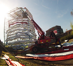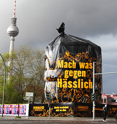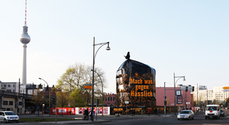 Mach was gegen Häßlich Passend zum Motto: „Wer seinen Schmuck liebt, liebt WEMPE Kudamm“ stürzt sich in 4 Metern Höhe ein Elsternschwarm in das Schaufenster der Filiale. Die 6 x 4m Meter große Installation zeigt 125 Vögel in 3 Flugphasen.