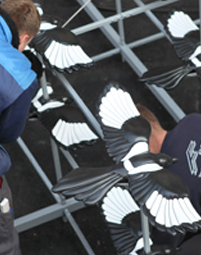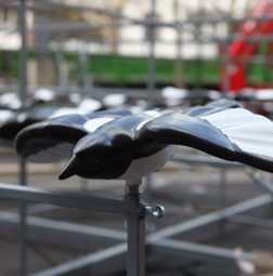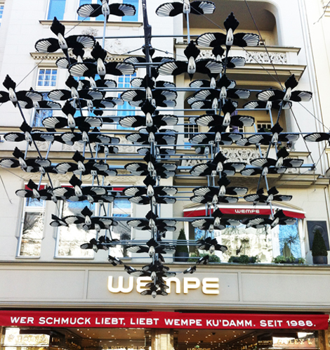 Überfall der Vögel Passend zum Motto: „Wer seinen Schmuck liebt, liebt WEMPE Kudamm“ stürzt sich in 4 Metern Höhe ein Elsternschwarm in das Schaufenster der Filiale. Die 6 x 4m Meter große Installation zeigt 125 Vögel in 3 Flugphasen.